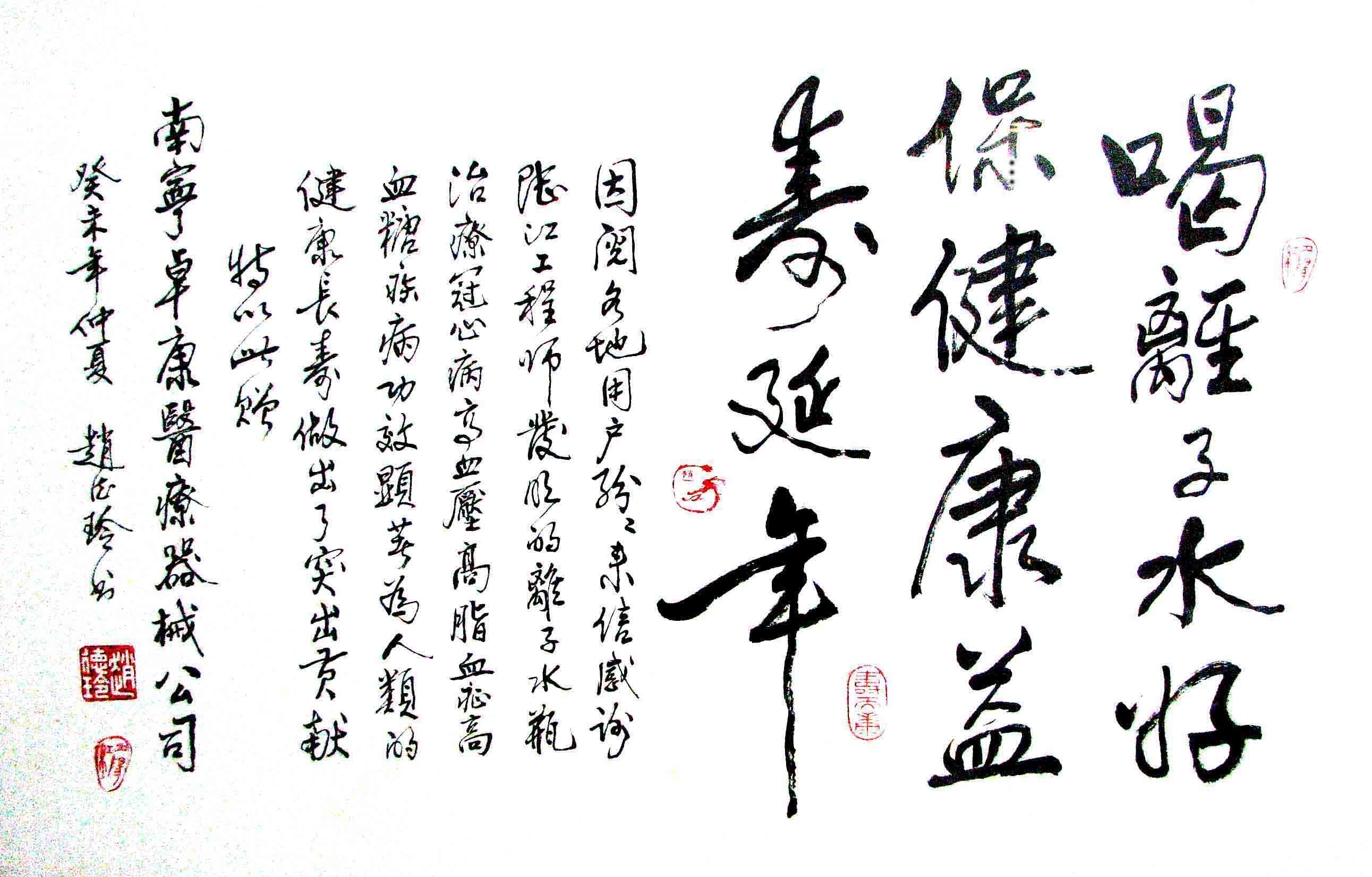 - -- 幾千年來,人類靠醫(yī)藥不能根治冠心病、高血壓和糖尿病,如想根治,那是夢(mèng)想。可是,我從中國基礎(chǔ)醫(yī)學(xué)研究成果受到啟發(fā),研發(fā)了一種發(fā)明產(chǎn)品,處理出微小分子團(tuán)水讓人飲用,實(shí)現(xiàn)了人類這一夢(mèng)想!患者飲用后遠(yuǎn)離了冠心病、高血壓和2型糖尿病。這一成果曾經(jīng)過臨床試用和專家鑒定,作為準(zhǔn)字號(hào)醫(yī)療器械讓廣大患者飲用,療效進(jìn)行跟蹤調(diào)查。很多患者的反饋情況令人感動(dòng),我放在公司網(wǎng)站上(nnzk.com),震撼了醫(yī)學(xué)專家,也使廣大同胞受到啟發(fā)。人們盼望飲用它給細(xì)胞補(bǔ)水,治愈多種病癥,既省錢,又安全,而且延長壽命。