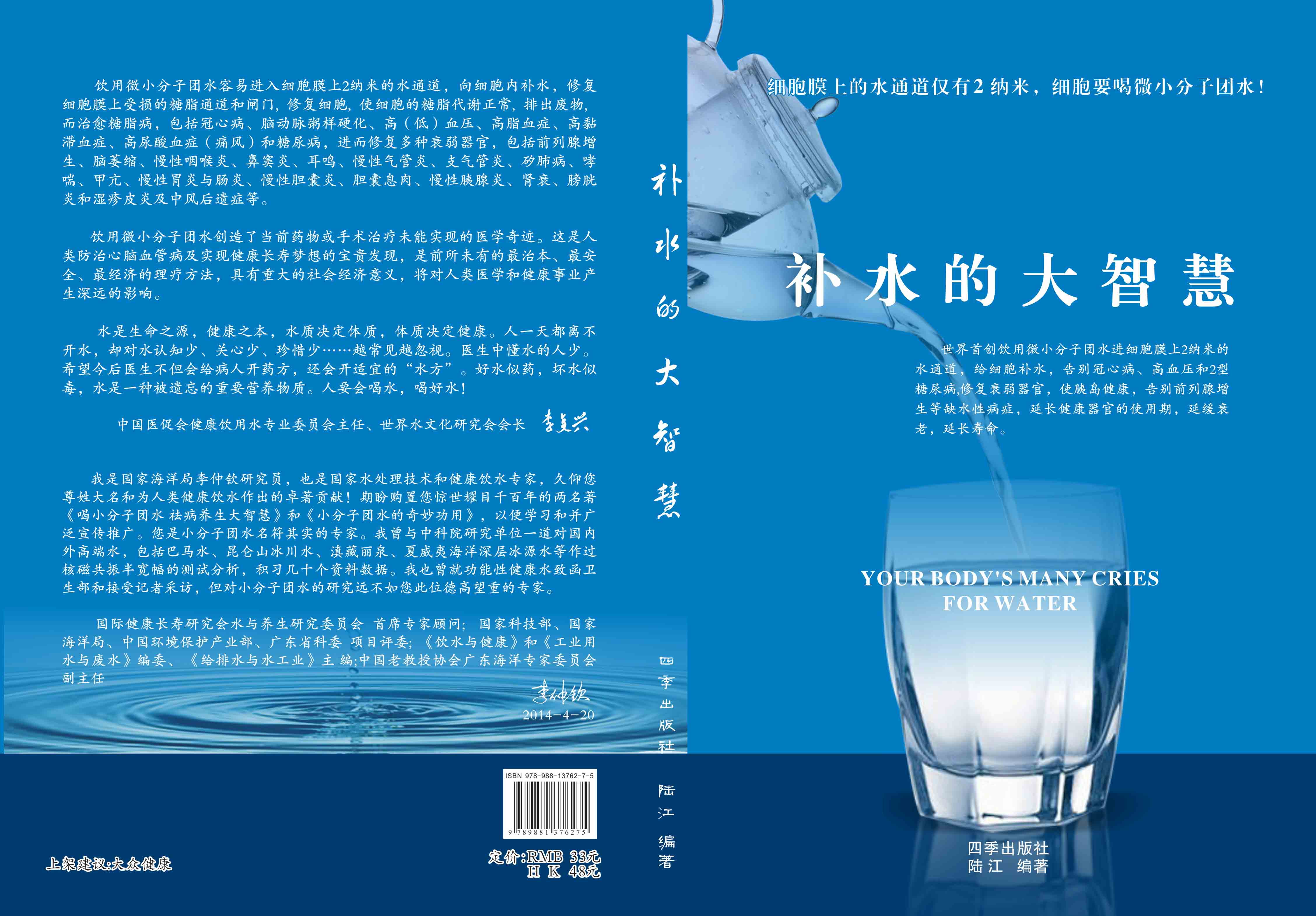 4. 陸 江新編著《延命水》一書,全彩色印刷A4內(nèi)頁P(yáng)240 ;2014年由香港出版的《補(bǔ)水的大智慧》一書,全彩色印刷16K內(nèi)頁P(yáng)218,郵購贈(zèng)此書,均送光盤。