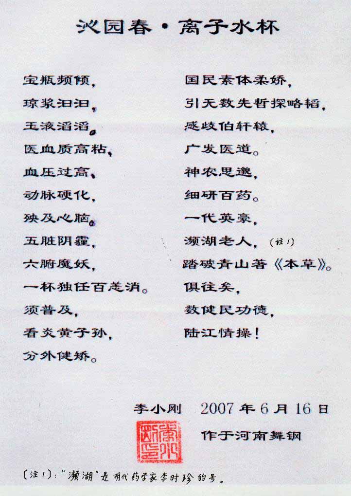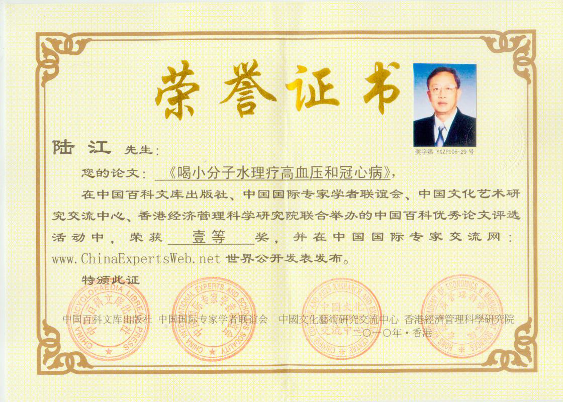 -----我是從事建筑的高工,本來沒有資格去攻克醫(yī)學(xué)難題,卻為了自身健康才扣響醫(yī)學(xué)的大門。由于我1990年患高血壓,因怕中風(fēng)才研究發(fā)明了離子水瓶,我把水處理成微小分子團(tuán)水,飲用后治愈了高血壓。便于1993年底送到三家省級(jí)醫(yī)院做臨床試用4個(gè)月。經(jīng)北京和廣西醫(yī)學(xué)專家鑒定:"降脂降壓效果好"," 能擴(kuò)大心腦動(dòng)脈流量,改善心腦電圖以及微循環(huán)","對(duì)治療心腦動(dòng)脈粥樣硬化、高血壓、高血脂有良好的醫(yī)療保健作用。""產(chǎn)品的技術(shù)性能和療效達(dá)到了同類產(chǎn)品的國內(nèi)領(lǐng)先水平,經(jīng)廣西醫(yī)學(xué)科學(xué)情報(bào)研究所檢索,未見國外有類似報(bào)道。"中國醫(yī)學(xué)科學(xué)院張正國教授從美國國立醫(yī)學(xué)圖書館數(shù)據(jù)庫存Medline檢索英俄文資料,均未見類似報(bào)告。2000年上市后,我為了對(duì)消費(fèi)者負(fù)責(zé)而繼續(xù)觀察研究,一直通過《信譽(yù)卡》和《質(zhì)量跟蹤調(diào)查書》向患者承諾療效,請(qǐng)用戶使用6個(gè)月后反饋效果。和脂壓患者飲用2至5個(gè)月內(nèi),消除癥狀,停服藥物,血壓正常;冠心病患者飲用3~5個(gè)月逐漸減輕至消除心絞痛、房顫等癥狀,不再服藥,飲用1年左右心電圖正常,經(jīng)冠脈造影掃描無明顯狹窄,表明冠心病痊愈。大量患者還反映許多衰弱器官被修復(fù),讓前列腺增生、慢性咽喉炎、慢性氣管炎、支氣管炎、慢性胃炎、腸炎和膽囊炎等不藥而愈;2型糖尿病患者是因?yàn)橐葝u衰弱致病,飲用該水半年至一年,逐漸減藥至停藥,血糖尿糖正常,真正治愈2型糖尿病。中風(fēng)后遺癥患者飲用六七個(gè)月,可逐漸減輕至消除肢體和語言障礙,表明飲用該水能讓壽命很長的神經(jīng)元細(xì)胞逐漸修復(fù),奇跡般地恢復(fù)肢體和語言功能。飲用后還使胸腺和脾臟兩個(gè)重要的免疫器官被修復(fù)和增強(qiáng),產(chǎn)生免疫細(xì)胞多,提高了免疫力,使人不生病或少生病。自此, 飲用微小分子團(tuán)水創(chuàng)造了攻克冠心病、高(低)血壓和糖尿病三大醫(yī)學(xué)難題的奇跡。人們對(duì)此感到不可思議,但實(shí)踐是檢驗(yàn)真理的唯一標(biāo)準(zhǔn)。