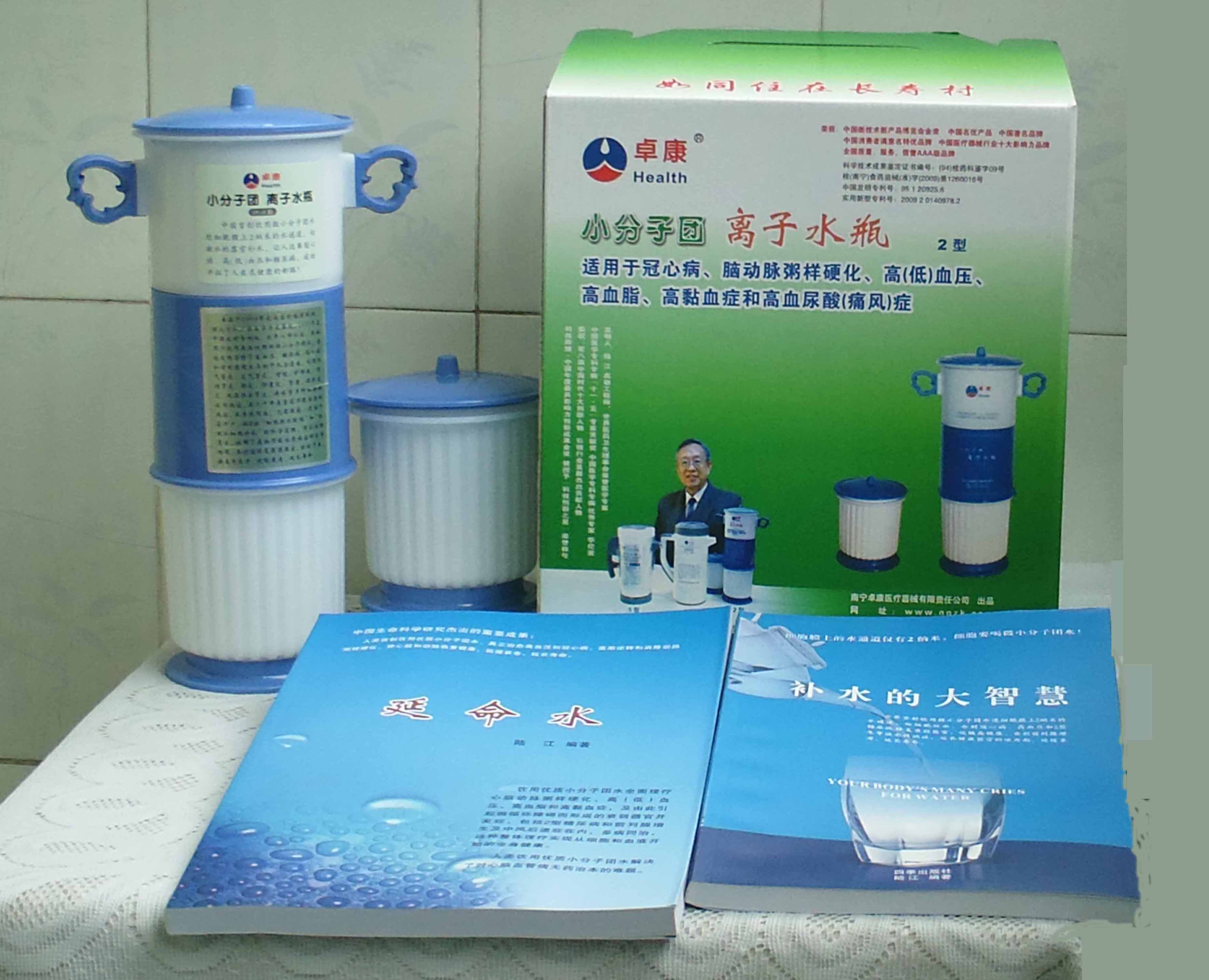 本品大量用戶的使用效果表明,能治愈冠心病、腦動(dòng)脈硬化、原發(fā)性高(低)血壓、高血脂、高粘血癥、高血尿酸癥(痛風(fēng))和2型糖尿病、衰弱器官并發(fā)癥(前列腺增生、腎衰與尿毒癥)及中風(fēng)后遺癥等療效好。產(chǎn)品配信譽(yù)卡。使用壽命30年,不換芯,易清洗。團(tuán)購優(yōu)惠。從郵局匯款,匯費(fèi)1%,地址按本頁下方地址、聯(lián)系人寫。從銀行匯款,請(qǐng)點(diǎn)擊[聯(lián)系匯款]欄,從工商銀行匯款,建設(shè)銀行、農(nóng)業(yè)銀行匯款,均免收匯費(fèi),匯款后20--30分鐘內(nèi)發(fā)短信,可用微信轉(zhuǎn)帳,均免匯費(fèi),微信號(hào)即手機(jī)號(hào)13768308380。匯款后,告知你的姓名和地址,我公司聯(lián)系人手機(jī)號(hào)是:13768308380卓康牌離子水瓶為我公司獨(dú)家生產(chǎn),郵購產(chǎn)品配《補(bǔ)水的大智慧》彩印書一本,另配四季出版社出版的新書《補(bǔ)水的大智慧》一本,并配光盤一張(含央視主持人釆訪陸江的對(duì)話視頻)。目前市場(chǎng)和"淘寶網(wǎng)"上有人兜售假冒的偽品,望讀者審察辯別真?zhèn)危旒僬哓飧`假冒本公司的各種認(rèn)證、獲獎(jiǎng)獎(jiǎng)項(xiàng)、專利號(hào)和外包裝盒上的中英文字,包括科技成果的鑒定意見等,請(qǐng)讀者注意防偽。如何識(shí)別假貨?已經(jīng)買了假貨怎么辦?(請(qǐng)點(diǎn)擊[打假掠影][打假掠影])。