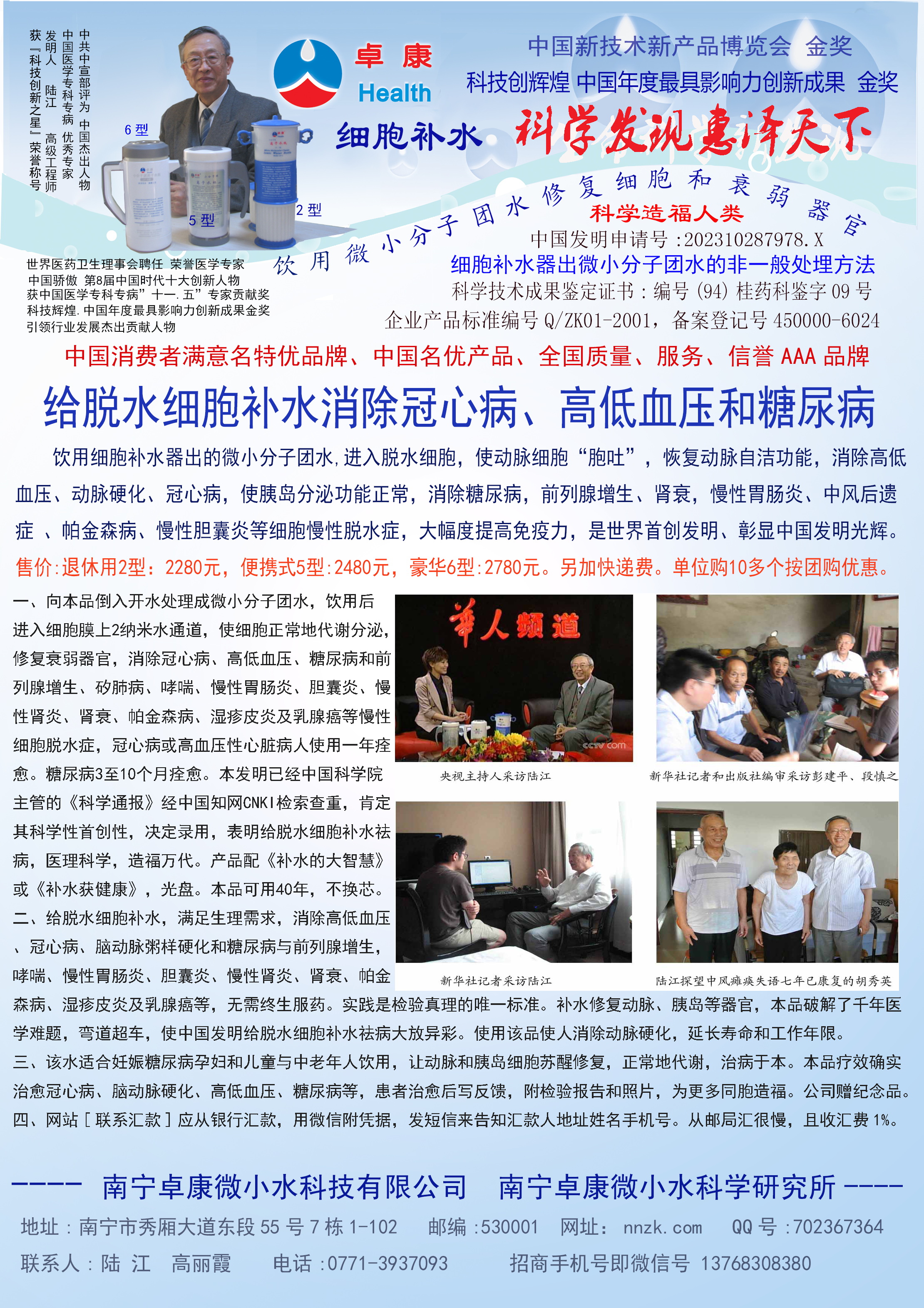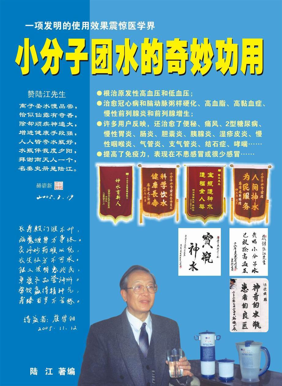 人類幾千年來患以上病癥需終生服藥,幾十年也不能治愈。可是我國南寧的高級(jí)工程師陸 江,于1990年想根治高血壓,研究發(fā)明了離子水瓶,處理出微小分子團(tuán)水供飲用,經(jīng)過醫(yī)院臨床試用和專家鑒定,1999年獲中國發(fā)明專利權(quán),產(chǎn)品于2000年投放市場(chǎng)后一直跟蹤調(diào)查,據(jù)全國各地用戶反饋:祛除了高低血壓、糖尿病和冠心病,并使前列腺增生、咽喉炎、鼻竇炎、慢性氣管炎、支氣管炎、矽肺病、哮喘、慢性胃炎、腸炎、慢性膽囊炎、慢性腎炎、腎衰、膀胱炎、便秘、痔瘡、風(fēng)濕性關(guān)節(jié)炎和濕疹皮炎及中風(fēng)后遺癥等病癥不藥而愈。為什么喝微小水能治20多種病?陸 江從1991年德國科學(xué)家發(fā)現(xiàn)細(xì)胞膜水通道僅為2納米獲得啟發(fā),認(rèn)為多種器官患病是因細(xì)胞脫水,不能正常代謝和分裂增殖,才使器官細(xì)胞減少致衰弱萎縮而形成細(xì)胞缺水性病癥。22年來的實(shí)踐有力地支持了“細(xì)胞脫水致病”這一重要論點(diǎn),表明喝微小水可滿足細(xì)胞的生理需求,補(bǔ)水就能祛病,是生命科學(xué)新亮點(diǎn)。